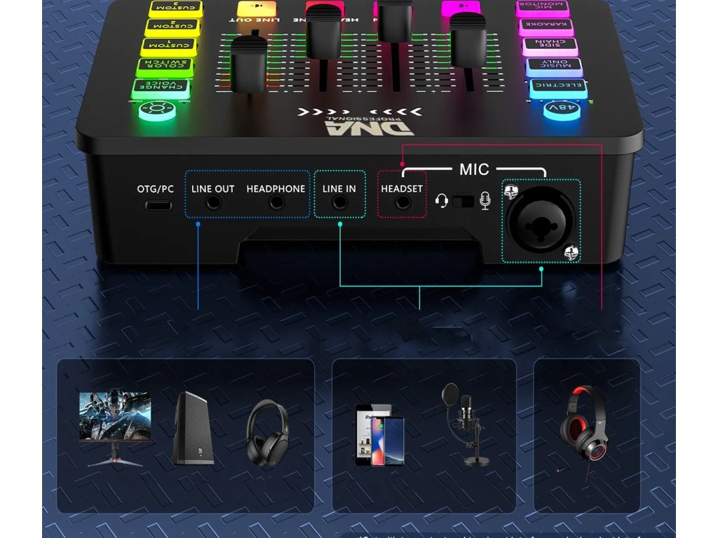 Osm režimů RGB podsvícení s pětistupňovou regulací jasu vytvoří unikátní atmosféru vašeho pracoviště. Můžete nahrávat a přehrávat až 3 vlastní zvukové efekty (každý o délce 15 sekund), což vám umožní odlišit se mezi tisíci tvůrci. Kombinované mikrofonní vstupy (XLR/jack 6,35 mm) a vstup pro headset (jack 3,5 mm), audio LINE IN (jack 3,5 mm) a audio LINE OUT (jack 3,5 mm) zaručují, že bez problémů připojíte veškeré své vybavení. DNA SC ONE je mistrem kontroly a kvality – od podcastů až po herní streamy.