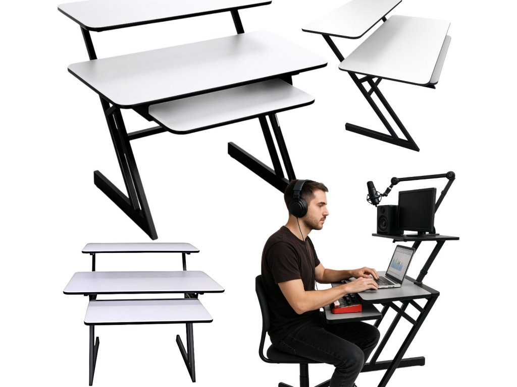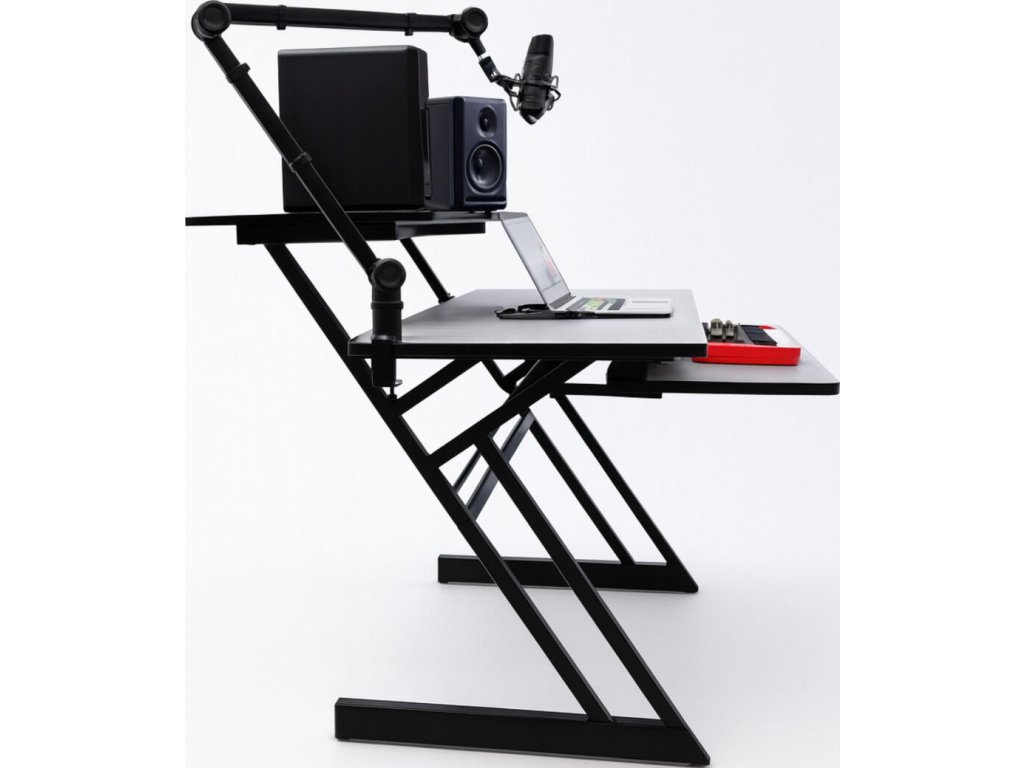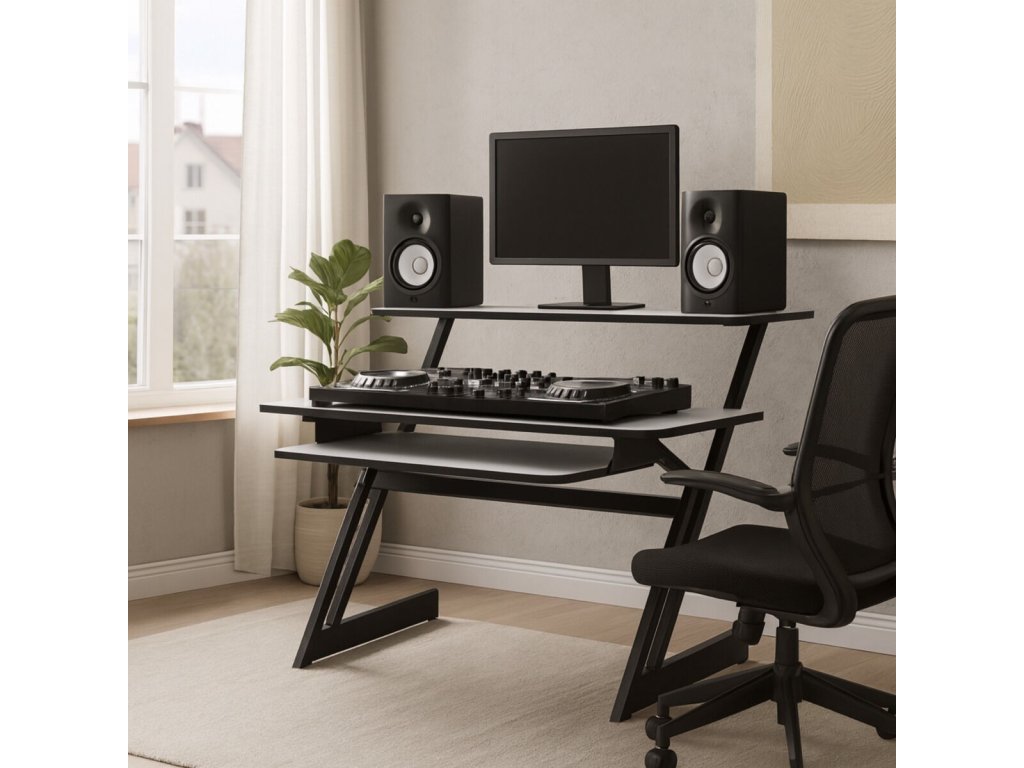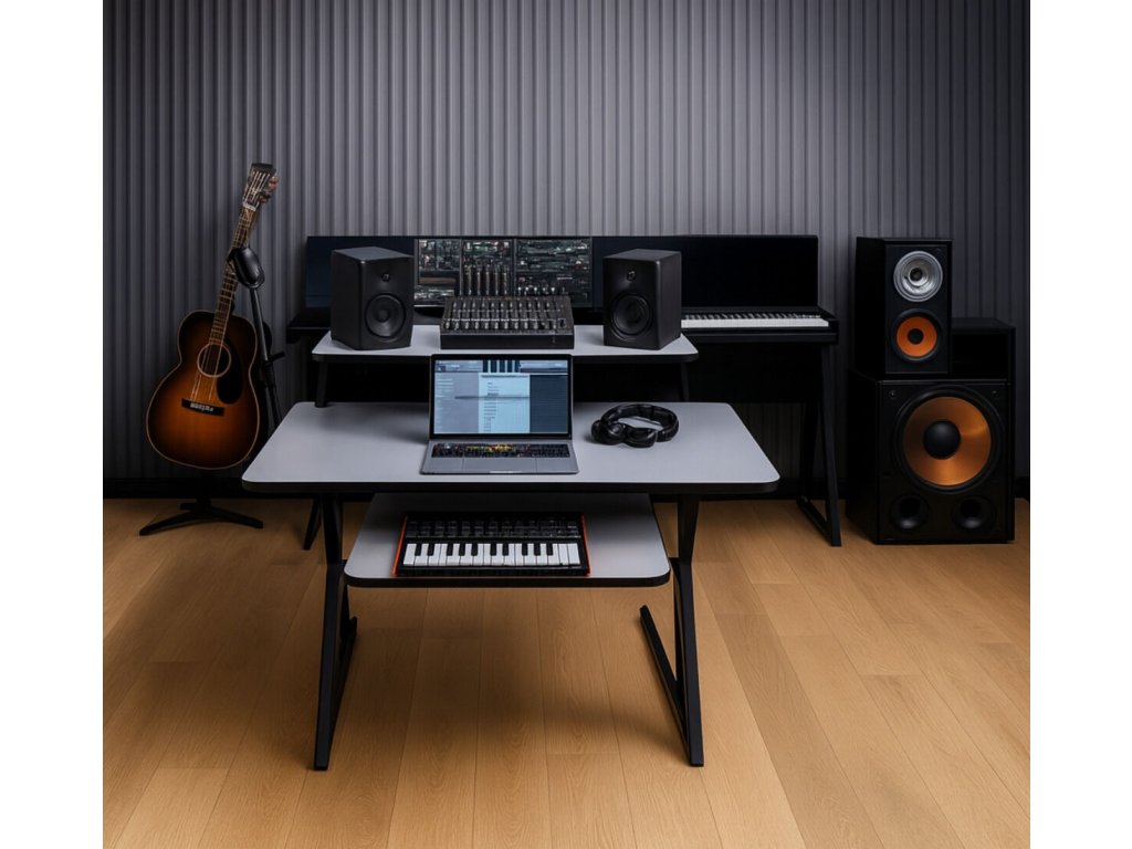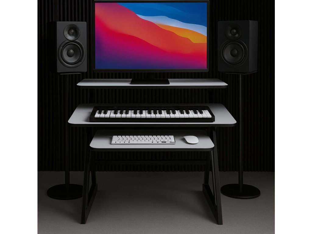 - Typ: studiový stůl, pracovní stanice s deskou, policí pro audio vybavení a výsuvnou policí na klávesnici- Maximální nosnost: 50 kg