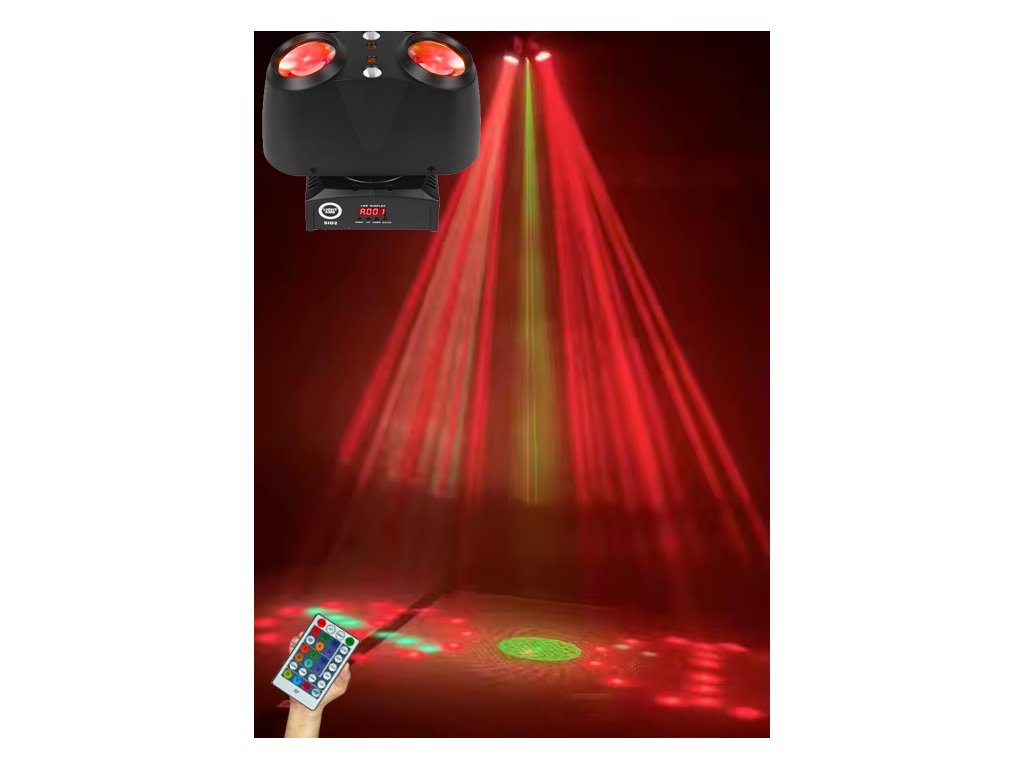 - Zdroj světla: beam: 120x0,5W RGBW LED 4v1 (36xR, 36xG, 36xB, 12xW), efekt strip a efekt circle s výběrem barvy, COB: 2x5W CW LED (studená bílá), červený laser: 100 mW, 650 nm, obousměrná rotace s nastavitelnou rychlostí, zelený laser: 30 mW, 532 nm, obousměrná rotace s nastavitelnou rychlostí
