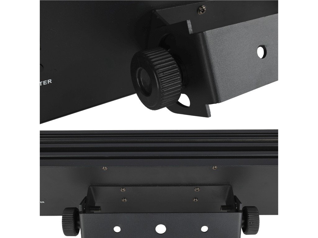 komponenty blinderu jsou uzavřeny v robustním hliníkovém šasi. Hlavní část tvoří světelný panel pracující v barevné paletě RGB (červená, zelená, modrá). Skládá se ze systému 666 LED diod (RGB) o výkonu 0,3 W. Na zadní straně pódiového stroboskopu se nachází pevný montážní držák (součást balení), který umožňuje instalaci lišty na konstrukce a osvětlovací rampy. Kromě montážního držáku se v zadní části nacházejí také napájecí konektory PowerCon (vstup a výstup), vstup a výstup pro DMX signál a ovládací panel v podobě digitálního LED displeje a čtyř tlačítek (Menu, Up, Down, Enter). Pomocí něj můžeme zvolit jeden z provozních režimů osvětlovače:
