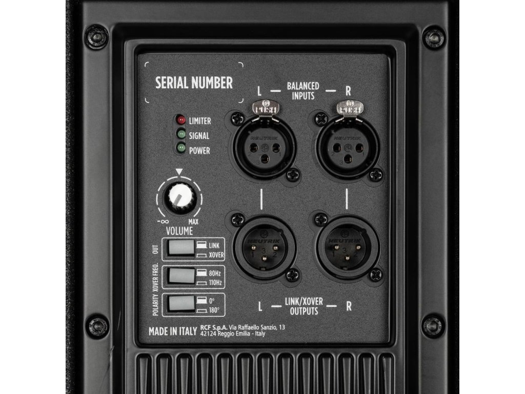 Vylepšení konstrukce reproduktorů společnosti RCF je činí silnějšími a výkonnějšími, takže zesilovač drží krok s vývojem. S maximálním výkonem 1400 W zvládá Class-D zesilovač extrémní hladiny akustického tlaku s ultrarychlým náběhem, realistickou přechodovou odezvou a velmi nízkými tepelnými ztrátami. Konstrukce reproduktorů je energeticky úsporná, takže není potřeba chlazení ventilátorem. Zesilovač je připevněn k pevnému hliníkové výměníku tepla v zadní části skříně bez pohyblivých částí. Stereo vstupní obvod s crossoverem se vyznačuje novým designem s nízkým zkreslením a pokročilým bezpečnostním limiterem, který zachovává skutečný charakter vstupního signálu na všech úrovních. Zesilovače RCF jsou navrženy podle normy EN62368-1 pro maximální bezpečnost a jsou vybaveny sekcí spínaného napájecího zdroje, která spojuje vysokou účinnost s minimální hmotností.