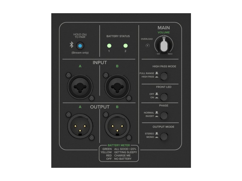 - Ovládání: Bluetooth (Hold to Pair), Main Volume, High Pass Mode, Front LED, Phase, Output Mode