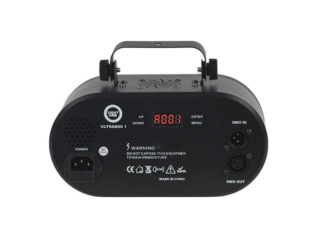 Light4Me Ultrabox 1 byl navržen s ohledem na maximální pohodlí uživatele. Je vybaven ovládacím panelem s LED displejem a čtyřmi tlačítky, což umožňuje snadné a intuitivní nastavení preferovaných parametrů. Třída IP20 chrání zařízení před vniknutím pevných cizích těles o průměru 12,5 mm a větších, čímž zajišťuje odpovídající ochranu ve vnitřních podmínkách, což činí zařízení ideálním pro dlouhodobé používání. Černé pouzdro dodává eleganci a umožňuje snadno sladit světelný efekt s jakýmkoliv místem. Součástí sady je robustní montážní držák, který umožňuje rychlou a pohodlnou montáž zařízení na konstrukce a osvětlovací rampy.
