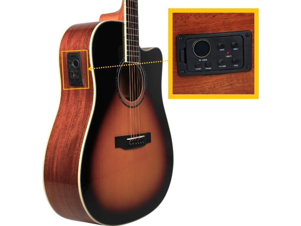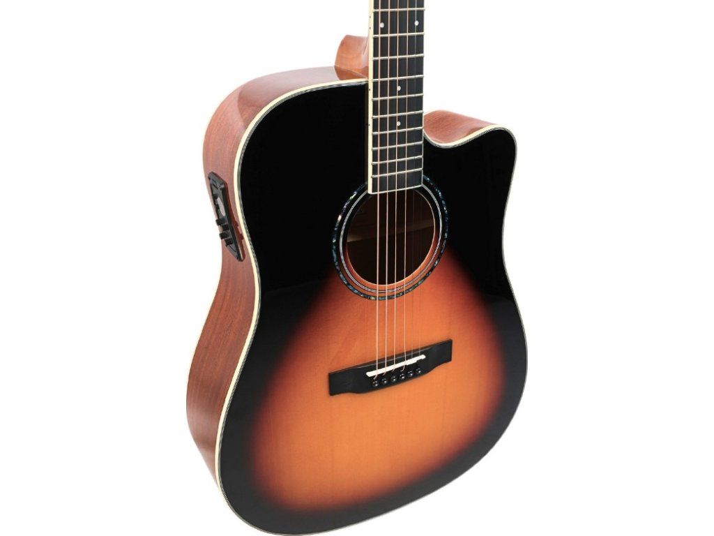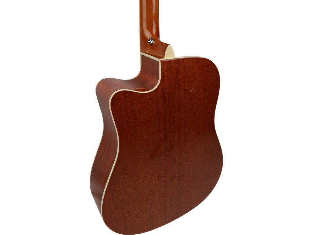 - Rezonanční tělo: barva: sunburst, délka: 41 palců (104,14 cm)tvar: dreadnought, výřez (cutaway): ano, materiál přední desky: smrková překližka, materiál lubů a zadní desky: mahagonová překližka, rozeta: ABS vodní nálepka, lemovka přední desky: ABS v barvě slonové kosti + bílá/černá linka, lemovka zadní desky: ABS v barvě slonové kosti, lemovka lubů: ABS v barvě slonové kosti + černá linka
