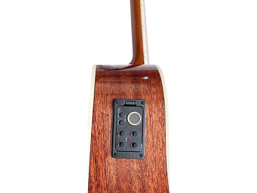 Použití smrkové překližky na přední desku a mahagonu na luby a zadní desku činí kytaru mimořádně odolnou a umožňuje dosáhnout teplého a bohatého zvuku. Přírodní barva hlavy s mahagonovou dýhou dodává profesionální vzhled, který na pódiu upoutá pozornost. Dvoucestná výztuha krku nastavitelná u ozvučného otvoru umožňuje přesné nastavení dohmatu, což je klíčové pro komfort při hře a čistotu tónu. Kytara je vybavena 20 pražci, což rozšiřuje hudební možnosti a umožňuje plné umělecké vyjádření. Materiály jako černý HPL hmatník a ABS v barvě slonové kosti použitý na lemovky (binding) zajišťují odolnost a estetický vzhled.