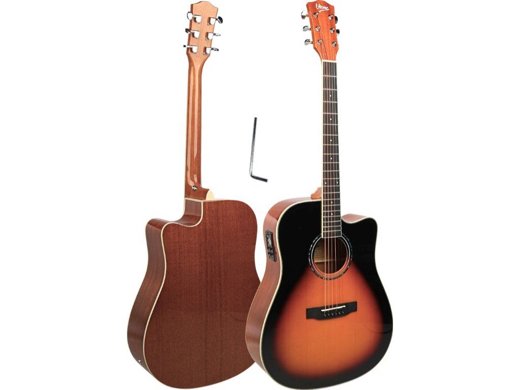 V-TONE VEAG1 CE VS je vysoce kvalitní, plnohodnotná elektroakustická kytara, která je vynikající volbou jak pro začátečníky, tak pro pokročilé hudebníky. Povrchová úprava ve vysokém lesku v barvách natural a sunburst dodává nástroji eleganci, díky čemuž je nejen hudebním nástrojem, ale také stylovým doplňkem. Díky pohodlné délce a tvaru dreadnought s výřezem (cutaway) zajišťuje kytara snadný přístup k vyšším polohám hmatníku, což umožňuje hru složitých akordů i sól. Zároveň zaručuje plný, hluboký zvuk, který uspokojí i to nejnáročnější ucho.
