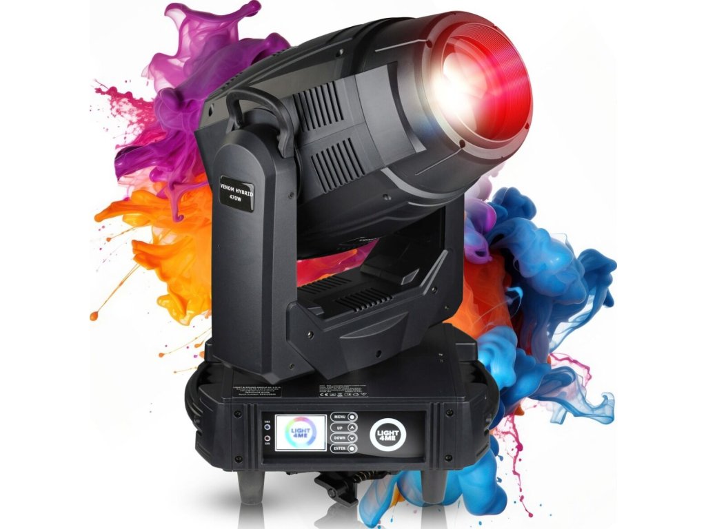 Light4Me Venom Hybrid 470W je pokročilé pódiové DMX osvětlení, které bylo navrženo s ohledem na koncerty, venkovní akce, hudební kluby, divadla, kulturní domy a rentalové firmy, které očekávají preciznost, velkolepé efekty a plnou kontrolu nad světlem. Díky bílé LED diodě o výkonu 470W, elektronickému zoomu 3–35° a rozsáhlým optickým efektům se toto svítidlo osvědčuje jak na velkých pódiích, tak v komornějších realizacích.