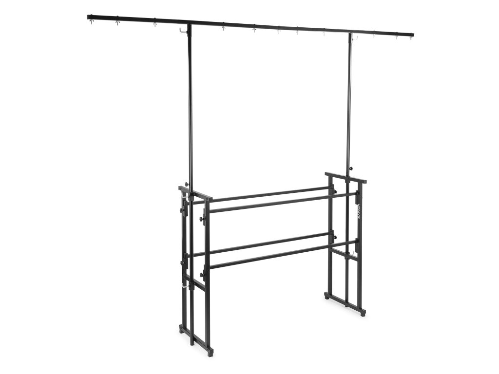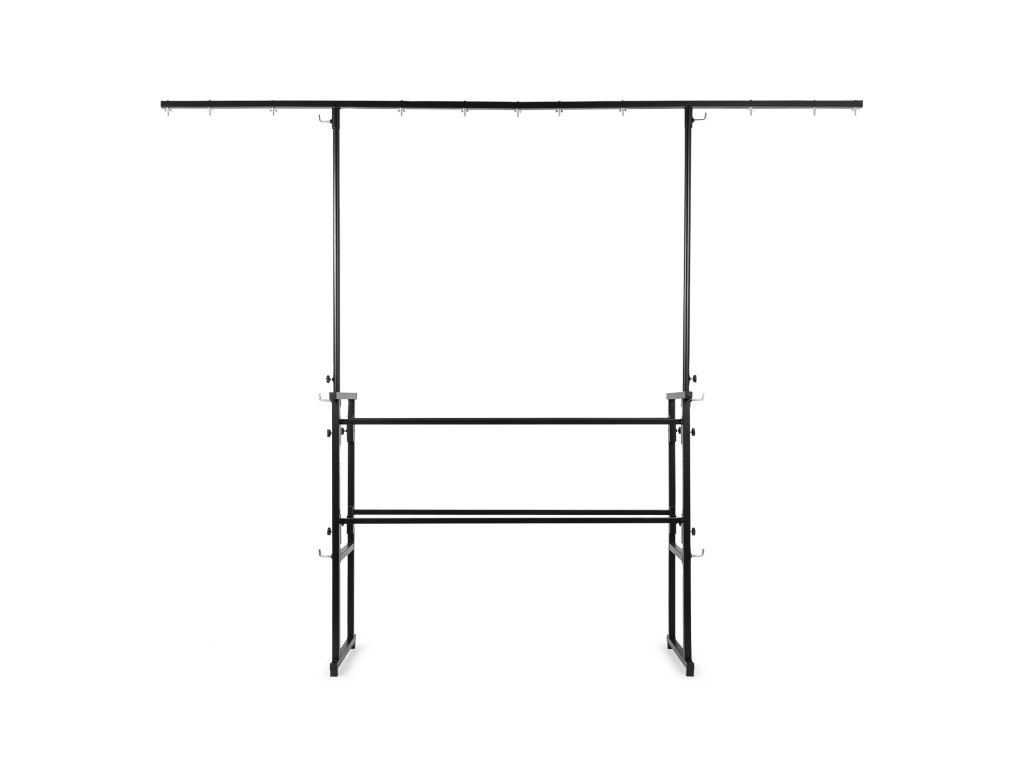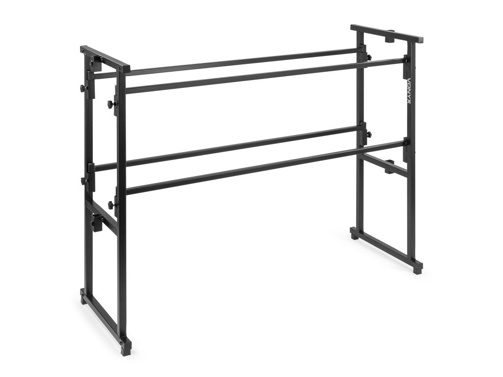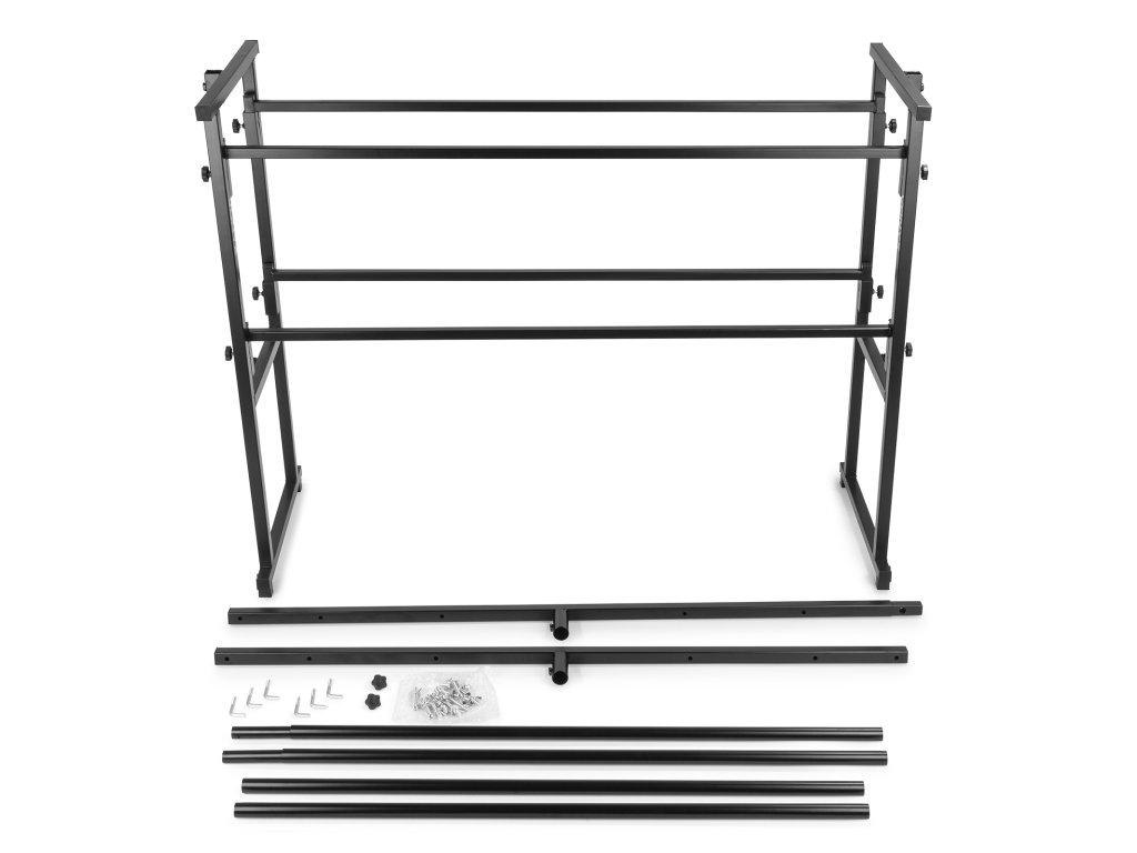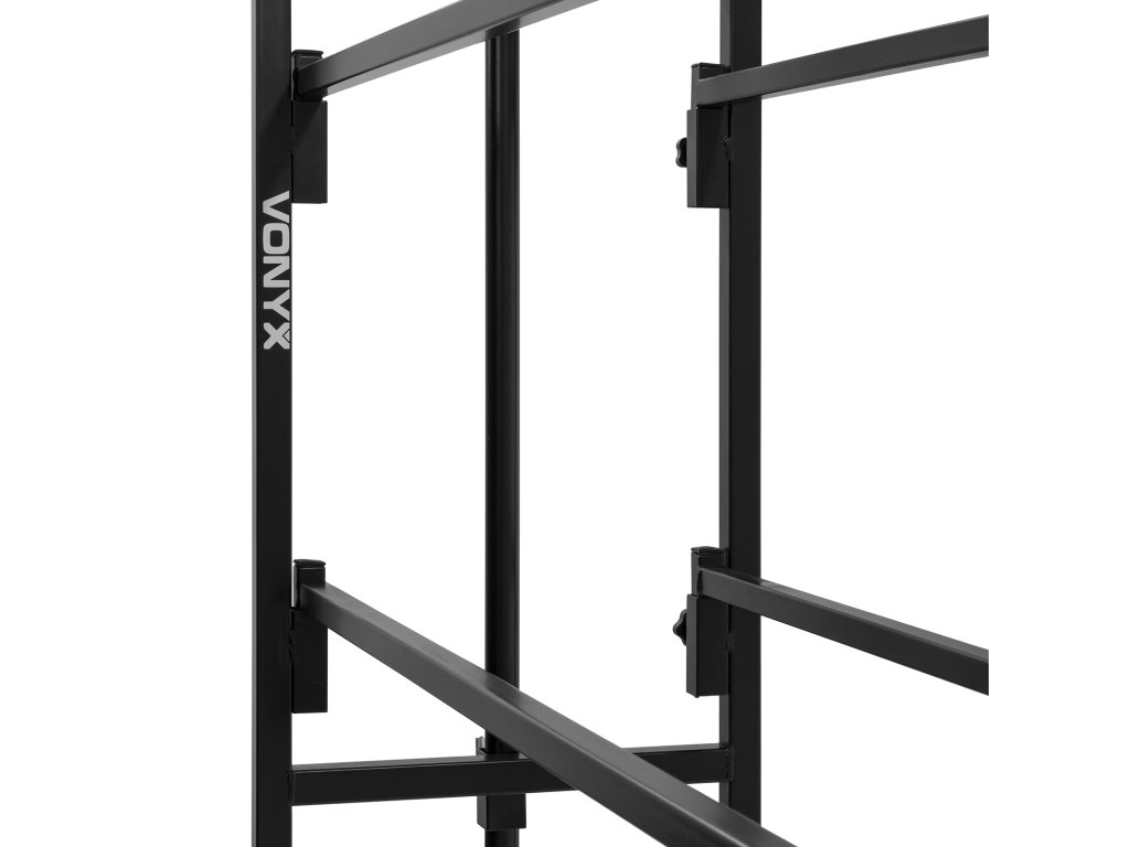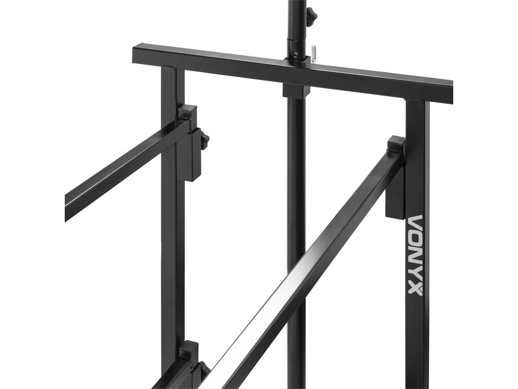 Multifunkční stojan určený pro instalaci DJ aparatury a světelných efektů. Konstrukce je navržena pro rychlou montáž a demontáž. Stojan se skládá ze základny se dvěma úrovněmi a odnímatelné T-hrazdy. Horní úroveň o rozměrech 130 x 47 cm a pracovní výšce 100 cm je určena pro umístění primárního DJ vybavení, jako jsou mixážní pulty a přehrávače. Spodní úroveň poskytuje prostor pro další komponenty, například zesilovače, ekvalizéry nebo přepravní obaly. Součástí je výškově nastavitelná T-hrazda pro zavěšení světelných efektů. Její výšku lze regulovat v rozsahu 210 až 240 cm.