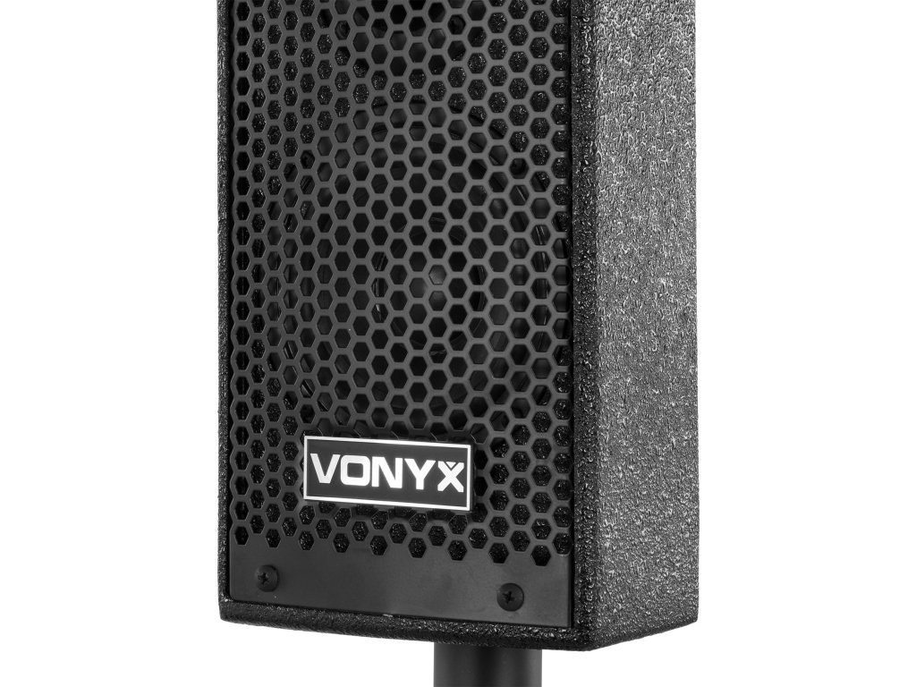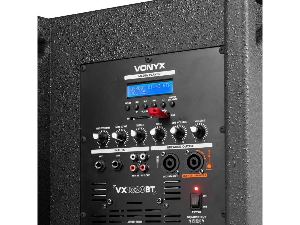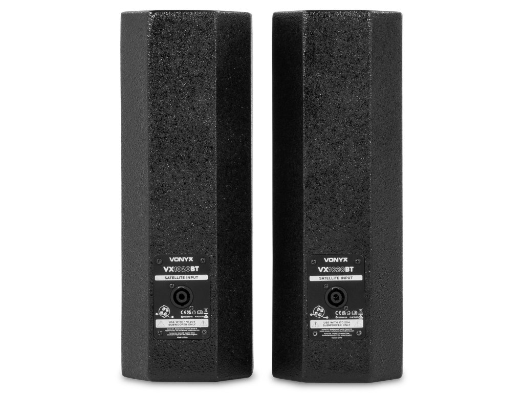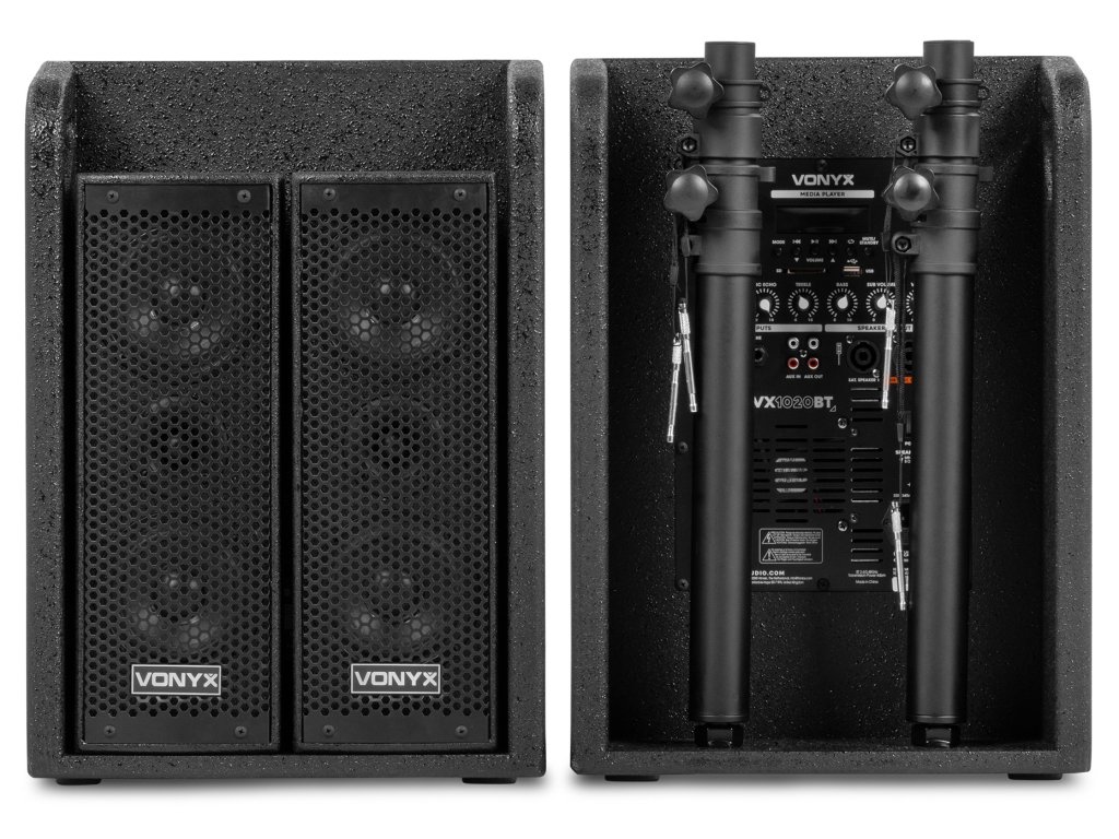 VX1020BT je kompletní reproduktorová sada typu plug & play. Vše, co potřebujete ke spuštění, je součástí balení. V jednom 10" subwooferu je vestavěn zesilovač, který napájí celý systém. Horní reproduktory i pasivní subwoofer jsou připojeny k jednotce se zesilovačem. Vestavěný přijímač Bluetooth vám umožňuje snadno streamovat hudbu bezdrátově ze smartphonu nebo můžete použít vestavěný MP3 přehrávač se sloty USB a SD.