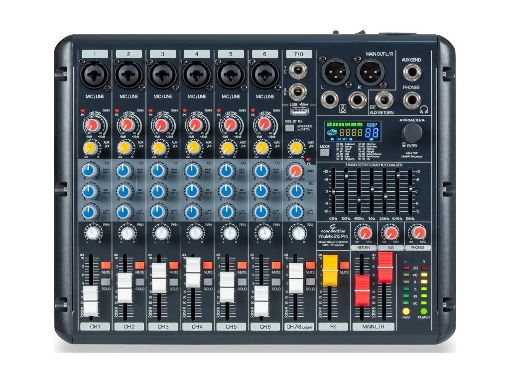 SOUNDSATION YOUMIX 610 PRO je ideální volbou pro všechny, kteří hledají kompaktní mixážní pult s robustní výbavou, který bez problémů zvládne jak streamování, tak i náročnější živé hraní.
